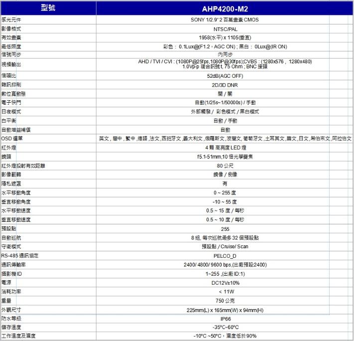 * 採用SONY 2.0MP, 1/2.9" CMOS 晶片