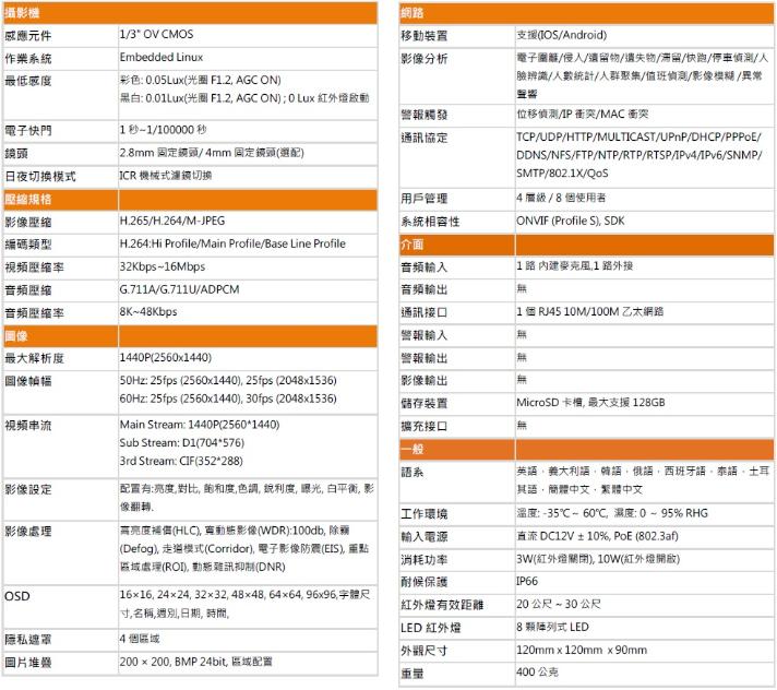 * 防水等級IP66 ; 支援POE 電源; 內建電源突波保護